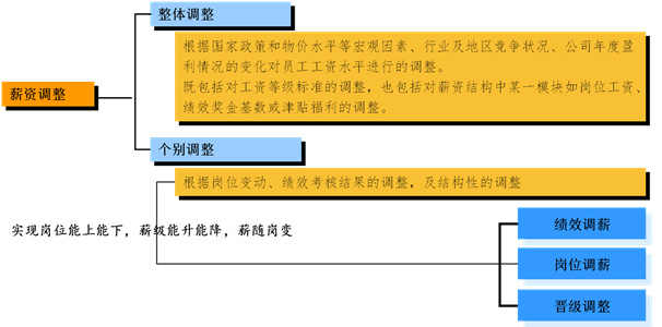 同时,根据公司内、外部经营环境的变化,建立公司整体调薪和个别调薪(包括岗位调薪、绩效调薪和晋级调薪)相结合的常态化薪酬调整机制,适时调整员工的薪资水平,充分发挥薪酬的激励作用。其中,绩效调薪和职位通道等级的晋级调薪为调整的主要方式,如图8所示: